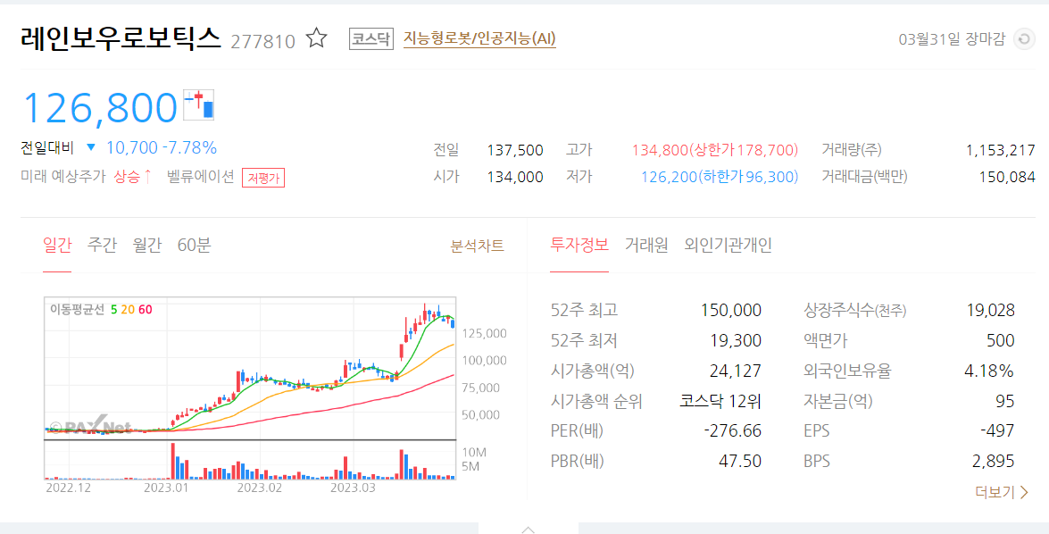 23년 3월 추가 매입 레인보우틱스의 보통주 91만 3936주를 주당 3만 400원에 장외매수. (지분율 14.99%) (매입가 278억원)